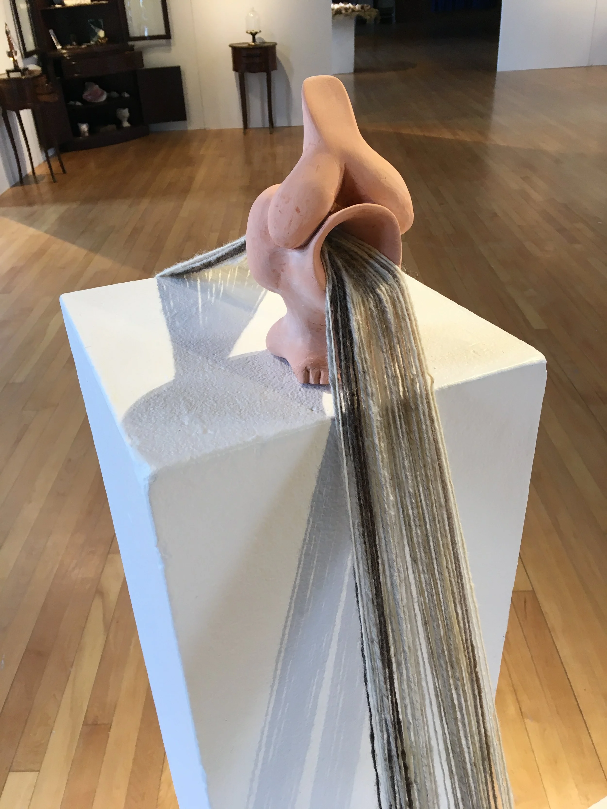 detail from "It is as natural to die as it is to be born" 2018 installation view hand carved plant dyed plaster ladies and eggs, handspun wool yarn 12'x12'